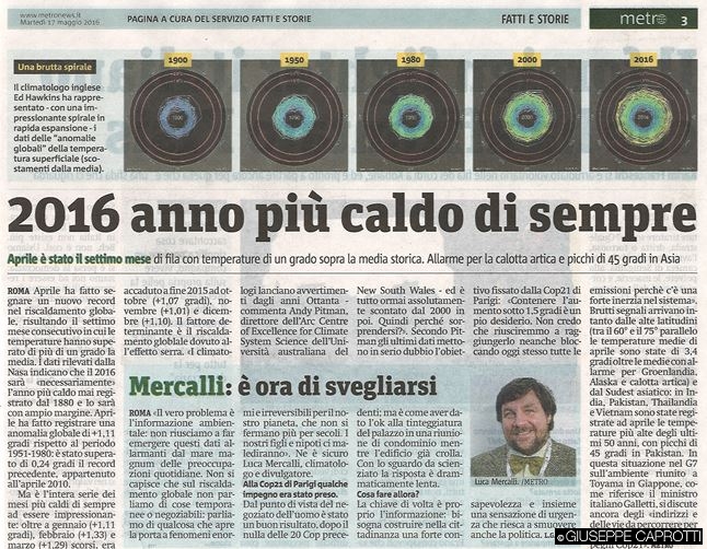 Aprile ha fatto registrare una anomalia globale di 1,11 gradi rispetto al periodo 1951-1980: è stato superato di 0,24 gradi il record precedente, appartenuto all’aprile 2010″
