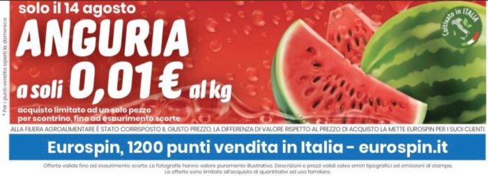Ha scatenato molte polemiche, specie su Twitter, l’iniziativa promozionale messa a punto dalla principale catena di discount in Italia. Eurospin, in una esasperata ricerca di (pseudo) convenienza ha pensato bene di vendere angurie a 0,01 centesimi al Kg. Ma solo per il 14 agosto…Un’offerta di sicuro effetto, ma che rappresenta uno schiaffo al valore delle filiere agricole e che ha suscitato immediate reazioni di protesta e di disappunto nella business community del retail.