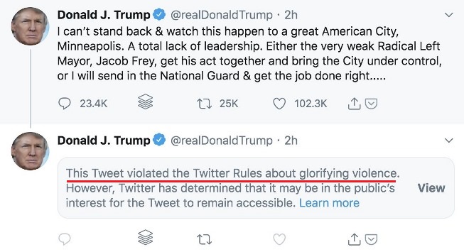 Sopra l’ultimo Tweet di Donald Trump del 29 maggio in cui Twitter segnala che Donald Trump glorifica la violenza (messaggio non eliminato)… A proposito dello strapotere delle società tecnologiche e del loro possibile cambiamento