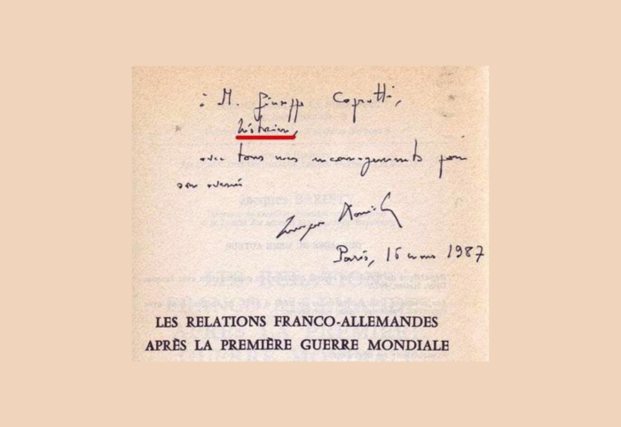 “A Giuseppe Caprotti, storico, con tutti i miei incoraggiamenti per il suo avvenire” Jacques Barièty, La Sorbona, Parigi 1987