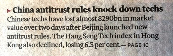 Scende il corso delle azioni di Alibaba, Tencent, JD.com, Meituan e Xiaomi (che è diventato il terzo produttore di cellulari al mondo, scavalcando Apple). Financial Times 12 novembre 2020.
