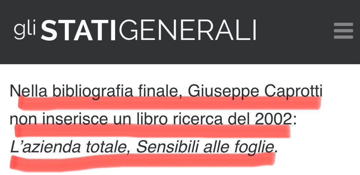 Nella bibliografia finale, Giuseppe Caprotti non inserisce un libro ricerca del 2002: L’azienda totale, Sensibili alle foglie.