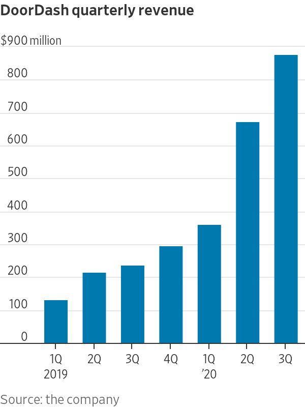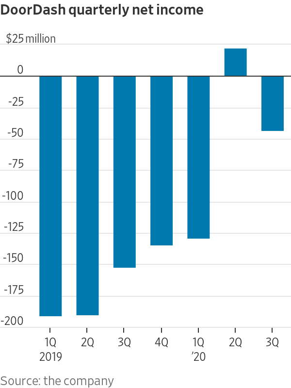 …DoorDash’s filing showed that for the three months ended in June, it reaped $675 million in revenue and posted a profit of $23 million. In the quarter ended in September, revenue grew to $879 million, though the company posted a net loss of $43 million..