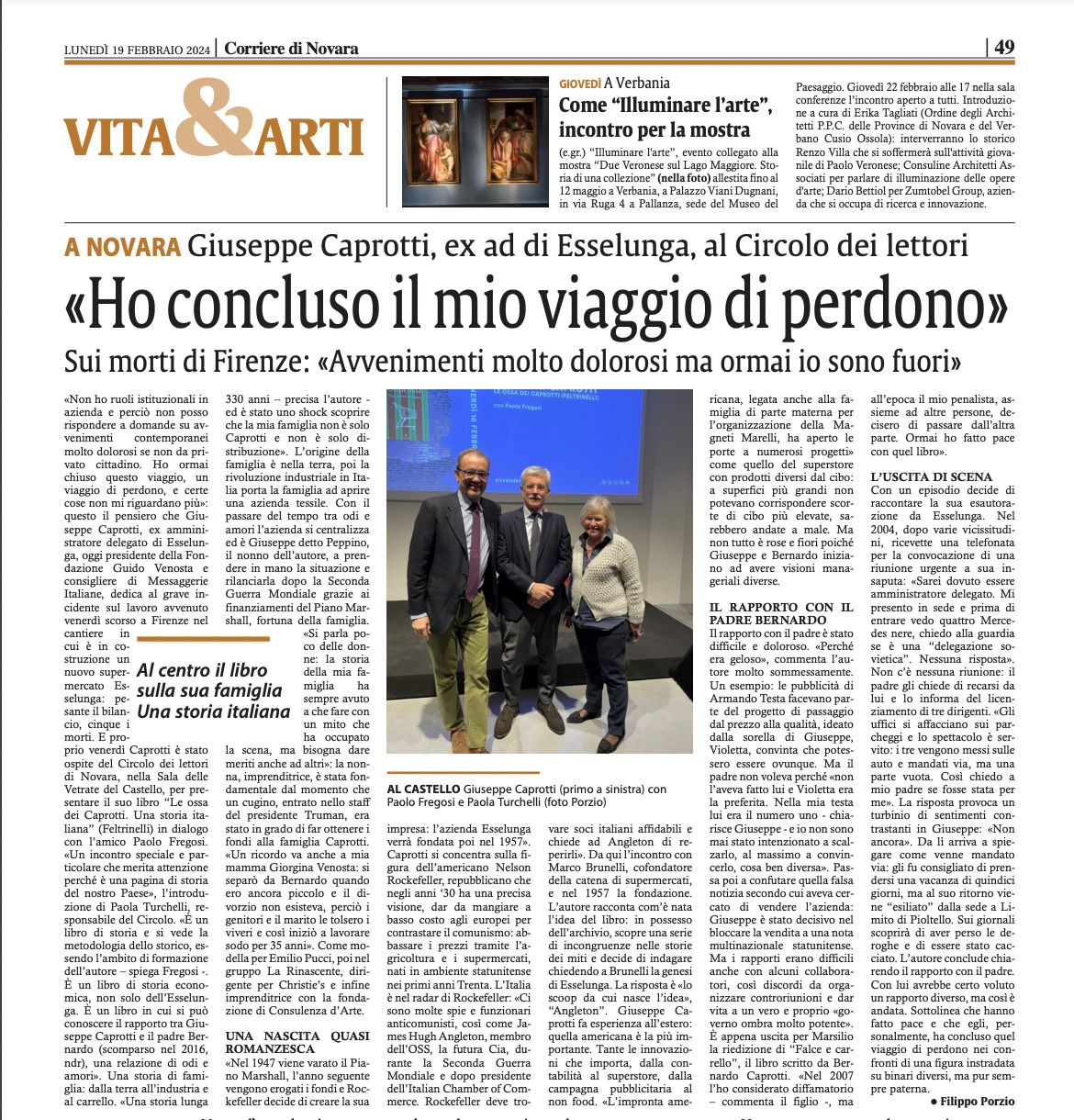 A NOVARA Giuseppe Caprotti, ex ad di Esselunga, al Circolo dei lettori «Ho concluso il mio viaggio di perdono»
