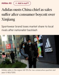 Quando le grandi marche, come Nike, H&M e Adidas, hanno preso le distanze dal lavoro forzato degli uiguri l’anno scorso, i consumatori cinesi hanno iniziato a boicottarle, favorendo marchi cinesi come Anta Sports e Li-Ning.