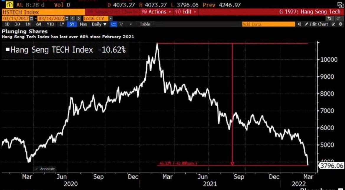 E sui rumors di legami tra Cina e Russia , ma – a dirla tutta – anche sulla strategia, anti Covid della Cina, l’indice Hang Seng oggi , 14 marzo 2022, è crollato.