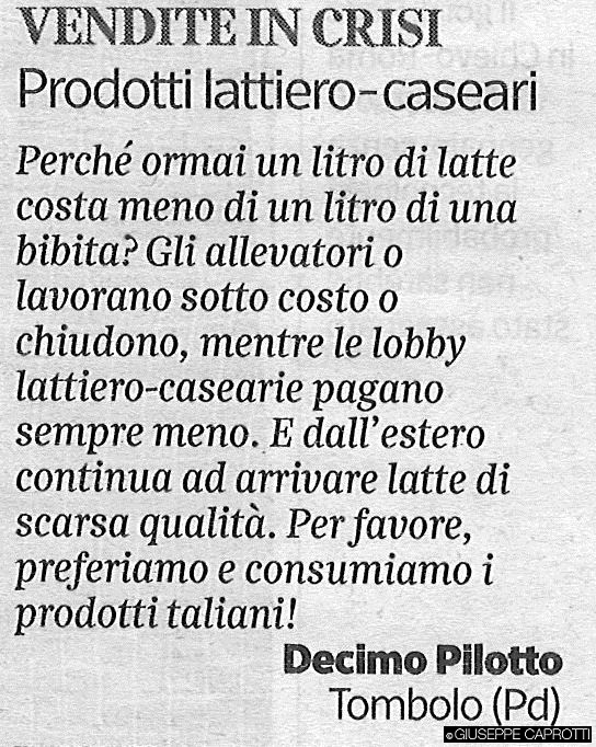…e quel che si capisce, tra le righe delle agenzie e dei quotidiani, è che il latte in Italia costa 50 € (*) alla tonnellata in più di quanto costi in Francia che, come abbiamo visto, è già fuori mercato, rispetto ad altri paesi .