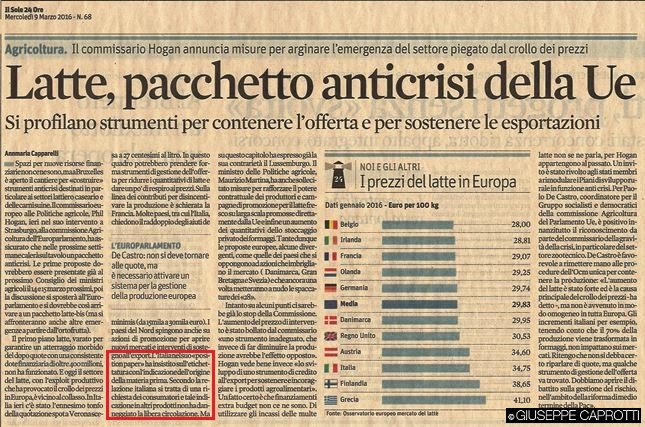 Lactalis, che in Italia possiede Parmalat, e che in Francia ritira 5,5 miliardi di litri all’anno, stà pagando in Francia il latte 270 € la tonnellata invece di 365 € come faceva nel 2014 (con picchi che avevano raggiunto i 400 €).