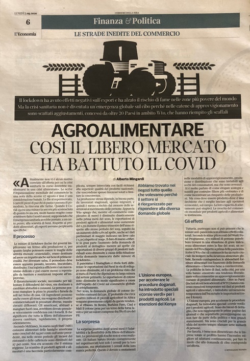 Una risposta alla mia domanda , seppur provvisoria e parziale , arriva dal Corriere Economia del 7 settembre 2020 (“Agroalimentare : così il libero mercato ha battuto il Covid” ) :