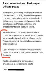 Iil 3 luglio 2023 , infatti, il geologo che se ne è occupato ci scriveva “Ricordo ancora una volta che se anche il pozzo sarà operativo … non lo si potrà utilizzare fino a che la Provincia non avrà rilasciato la concessione alla derivazione”.