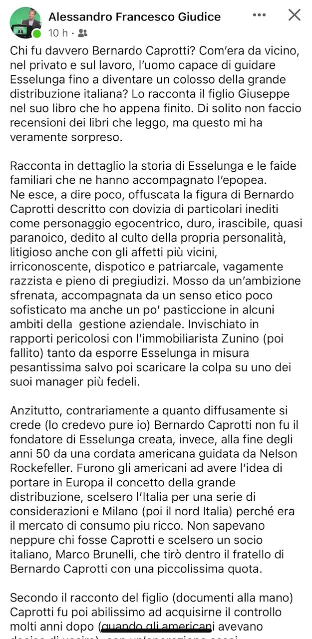 Secondo il racconto del figlio (documenti alla mano) Caprotti fu poi abilissimo ad acquisirne il controllo molti anni dopo (quando gli americani avevano deciso di uscire) con un’operazione assai spregiudicata, passando sopra amicizie e parentele. Rompendo perfino i rapporti con l’anziana madre (forse arrivando perfino a picchiarla) privandola del patrimonio e non esitando a gettare sul lastrico il suo stesso fratello. Inoltre, Bernardo Caprotti non era propriamente un “self made man” come spesso viene ricordato, ma il discendente (certamente più scaltro e spregiudicato dei fratelli) di una facoltosa dinastia imprenditoriale milanese molto bene inserita nell’alta borghesia industriale del dopoguerra. Non che questa fosse ovviamente una colpa, ma giusto per capire che, tra i meriti del personaggio, non può essere annoverato almeno quello dell’auto-elevazione sociale.