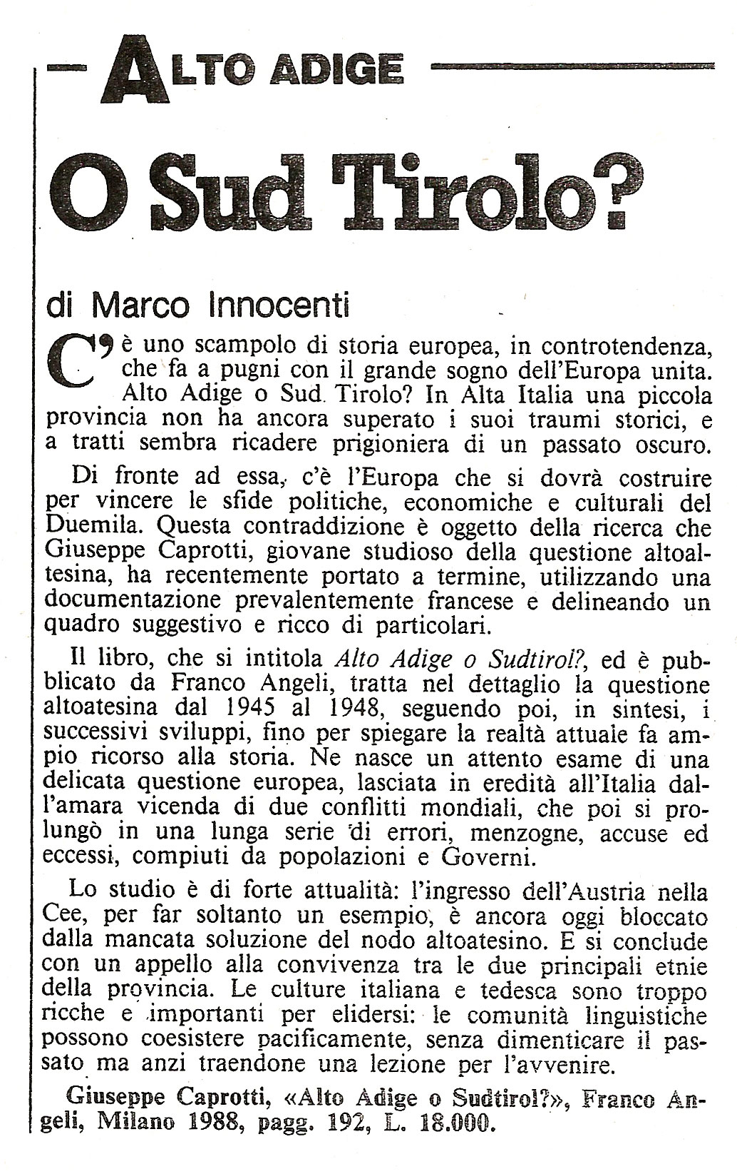 Di fronte ad essa, c’è l’Europa che si dovrà costruire per vincere le sfide politiche, economiche e culturali del Duemila. Questa contraddizione è oggetto della ricerca che Giuseppe Caprotti, giovane studioso della questione altoaltesina, ha recentemente portato a termine, utilizzando una documentazione prevalentemente francese e delineando un quadro suggestivo e ricco di particolari.