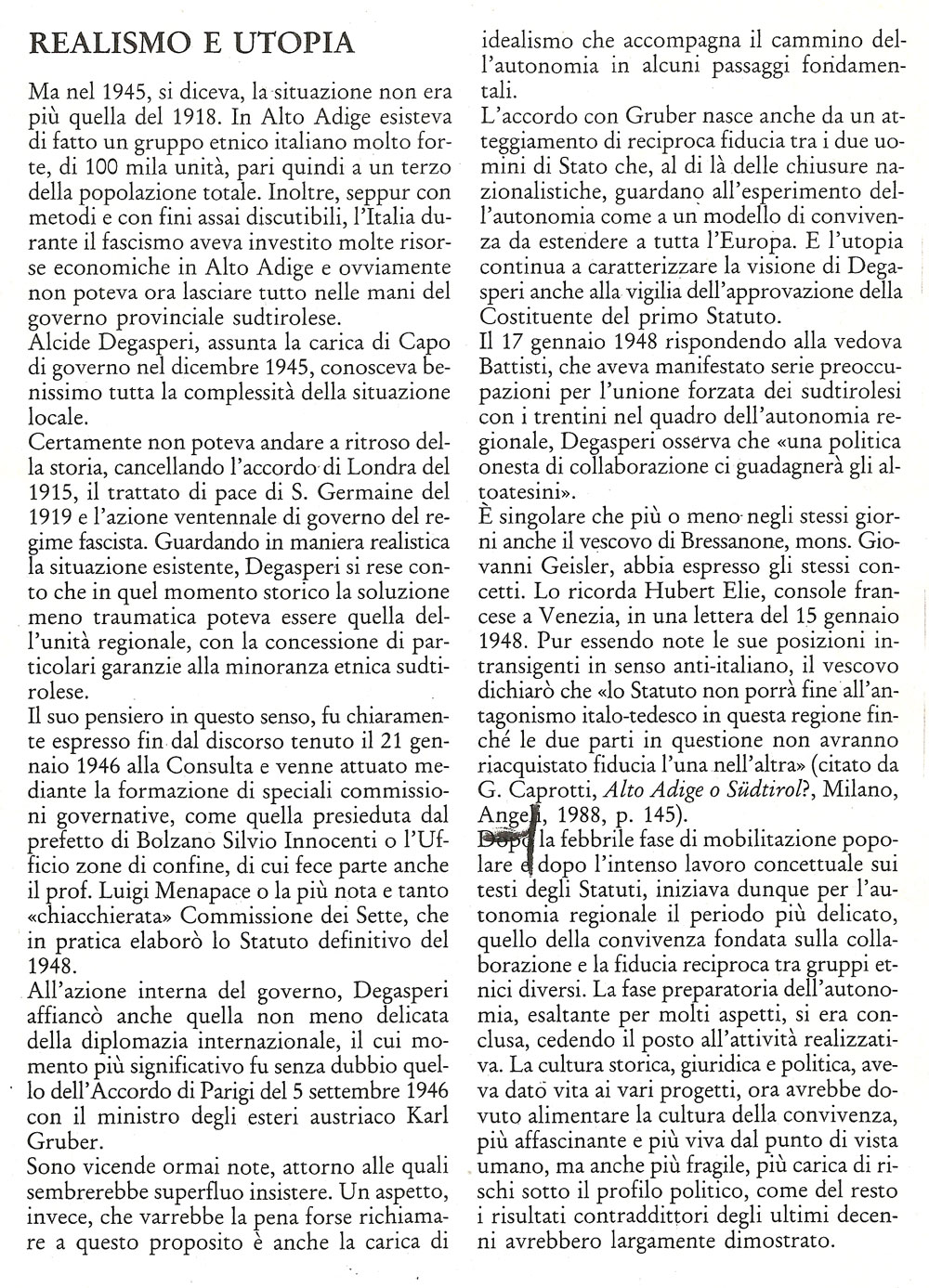 “Ma nel 1945, si diceva, la situazione non era più quella del 1918. In Alto Adige esisteva di fatto un gruppo etnico italiano molto forte, di 100 mila unità, pari quindi a un terzo della popolazione totale. Inoltre, seppur con metodi e con fini assai discutibili, l’Italia durante il fascismo aveva investito molte risorse economiche in Alto Adige e ovviamente non poteva ora lasciare tutto nelle mani del governo provinciale sudtirolese. Alcide De Gasperi, assunta la carica di Capo di governo nel dicembre 1945, conosceva benissimo tutta la complessità della situazione locale. Certamente non poteva andare a ritroso della storia, cancellando l’accordo di Londra del 1915, il trattato di pace di S. Germaine del 1919 e l’azione ventennale di governo del regime fascista. Guardando in maniera realistica la situazione esistente, De Gasperi si rese conto che in quel momento storico la soluzione meno traumatica poteva essere quella dell’unità regionale, con la concessione di particolari garanzie alla minoranza etnica sudtirolese. Il suo pensiero in questo senso, fu chiaramente espresso fin dal discorso tenuto il 21 gennaio 1946 alla Consulta e venne attuato mediante la formazione di speciali commissioni governative, come quella presieduta dal prefetto di Bolzano Silvio Innocenti o l’Ufficio zone di confine, di cui fece parte anche il prof. Luigi Menapace o la più nota e tanto «chiacchierata» Commissione dei Sette, che in pratica elaborò lo Statuto definitivo del 1948. All’azione interna del governo, De Gasperi affiancò anche quella non meno delicata della diplomazia internazionale, il cui momento più significativo fu senza dubbio quello dell’Accordo di Parigi del 5 settembre 1946 con il ministro degli esteri austriaco Karl Gruber. Sono vicende ormai note, attorno alle quali sembrerebbe superfluo insistere. Un aspetto, invece, che varrebbe la pena forse richiamare a questo proposito è anche la carica di idealismo che accompagna il cammino dell’autonomia in alcuni passaggi fondamentali. L’accordo con Gruber nasce anche da un atteggiamento di reciproca fiducia tra i due uomini di Stato che, al di là delle chiusure nazionalistiche, guardano all’esperimento dell’autonomia come a un modello di convivenza da estendere a tutta l’Europa. E l’utopia continua a caratterizzare la visione di De Gasperi anche alla vigilia dell’approvazione della Costituente del primo Statuto. Il 17 gennaio 1948 rispondendo alla vedova Battisti, che aveva manifestato serie preoccupazioni per l’unione forzata dei sudtirolesi con i trentini nel quadro dell’autonomia regionale, De Gasperi osserva che «una politica onesta di collaborazione ci guadagnerà gli altoatesini». È singolare che più o meno negli stessi giorni anche il vescovo di Bressanone, mons. Giovanni Geisler, abbia espresso gli stessi concetti. Lo ricorda Hubert Elie, console francese a Venezia, in una lettera del 15 gennaio 1948. Pur essendo note le sue posizioni intransigenti in senso anti-italiano, il vescovo dichiarò che «lo Statuto non porrà fine all’antagonismo italo-tedesco in questa regione finché le due parti in questione non avranno riacquistato fiducia l’una nell’altra» (citato da G. Caprotti, Alto Adige o Südtirol?, Milano, Angeli, 1988, p. 145).