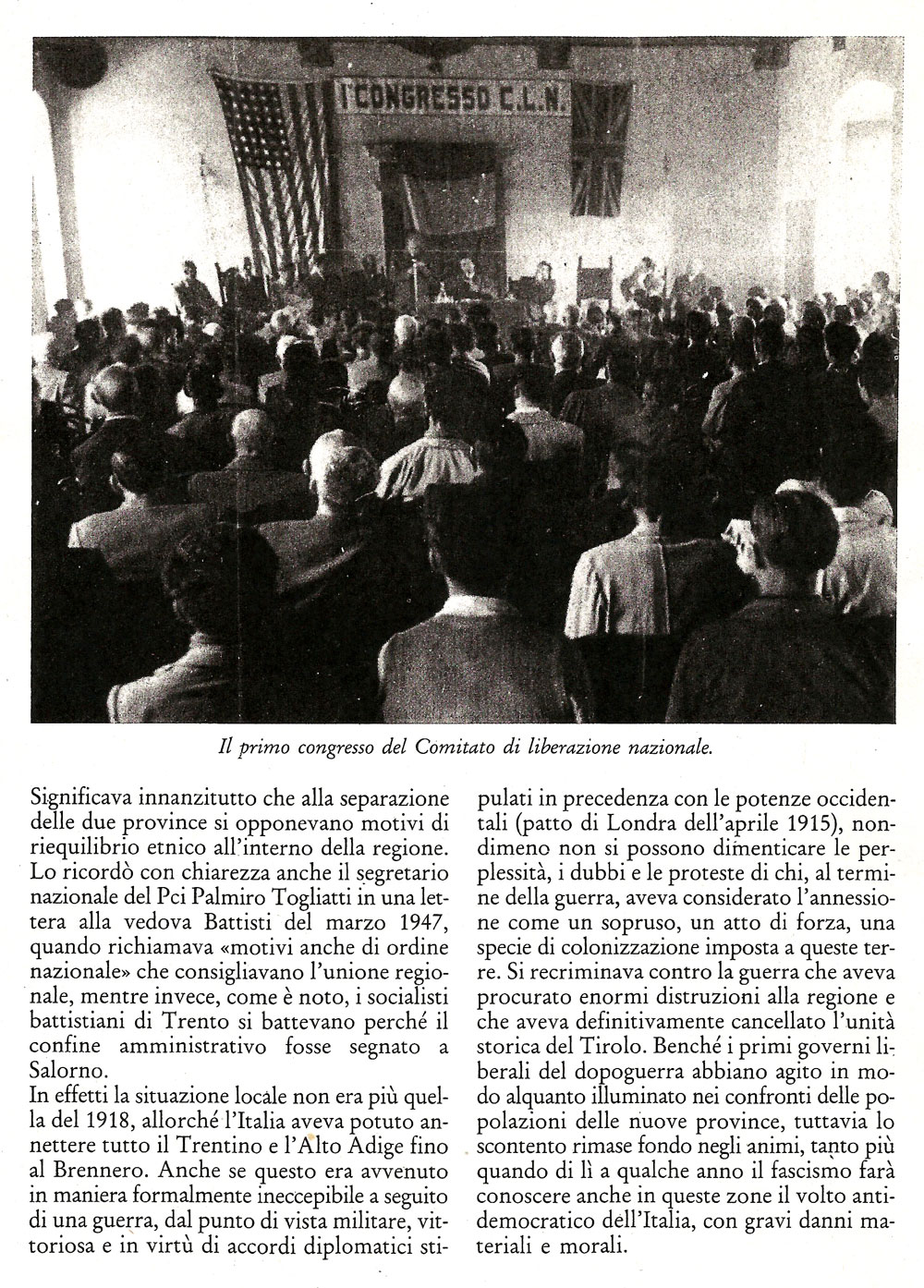 Significava innanzitutto che alla separazione delle due province si opponevano motivi di riequilibrio etnico all’interno della regione. Lo ricordò con chiarezza anche il segretario nazionale del Pci Palmiro Togliatti in una lettera alla vedova Battisti del marzo 1947, quando richiamava «motivi anche di ordine nazionale» che consigliavano l’unione regionale, mentre invece, come è noto, i socialisti battistiani di Trento si battevano perché il confine amministrativo fosse segnato a Salorno. In effetti la situazione locale non era più quella del 1918, allorché l’Italia aveva potuto annettere tutto il Trentino e l’Alto Adige fino al Brennero. Anche se questo era avvenuto in maniera formalmente ineccepibile a seguito di una guerra, dal punto di vista militare, vittoriosa e in virtù di accordi diplomatici stipulati in precedenza con le potenze occidentali (patto di Londra dell’aprile 1915), nondimeno non si possono dimenticare le perplessità, i dubbi e le proteste di chi, al termine della guerra, aveva considerato l’annessione come un sopruso, un atto di forza, una specie di colonizzazione imposta a queste terre. Si recriminava contro la guerra che aveva procurato enormi distruzioni alla regione e che aveva definitivamente cancellato l’unità storica del Tirolo. Benché i primi governi liberali del dopoguerra abbiano agito in modo alquanto illuminato nei confronti delle popolazioni delle nuove province, tuttavia lo scontento rimase fondo negli animi, tanto più quando di lì a qualche anno il fascismo farà conoscere anche in queste zone il volto antidemocratico dell’Italia, con gravi danni materiali e morali.“