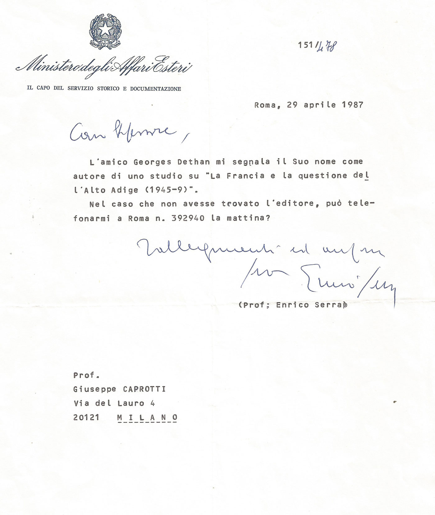 Come si può vedere Guillen mi aveva citato ma Bariéty, arrabbiato per la poca delicatezza di Dethan e preoccupato che pubblicassero un libro con il mio lavoro mettendoci la firma altrui, mosse “mari e monti” tanto che fui contattato dal professorEnrico Serra, capo del servizio storico e documentazione della Farnesina che mi mandò la lettera che qui ripropongo