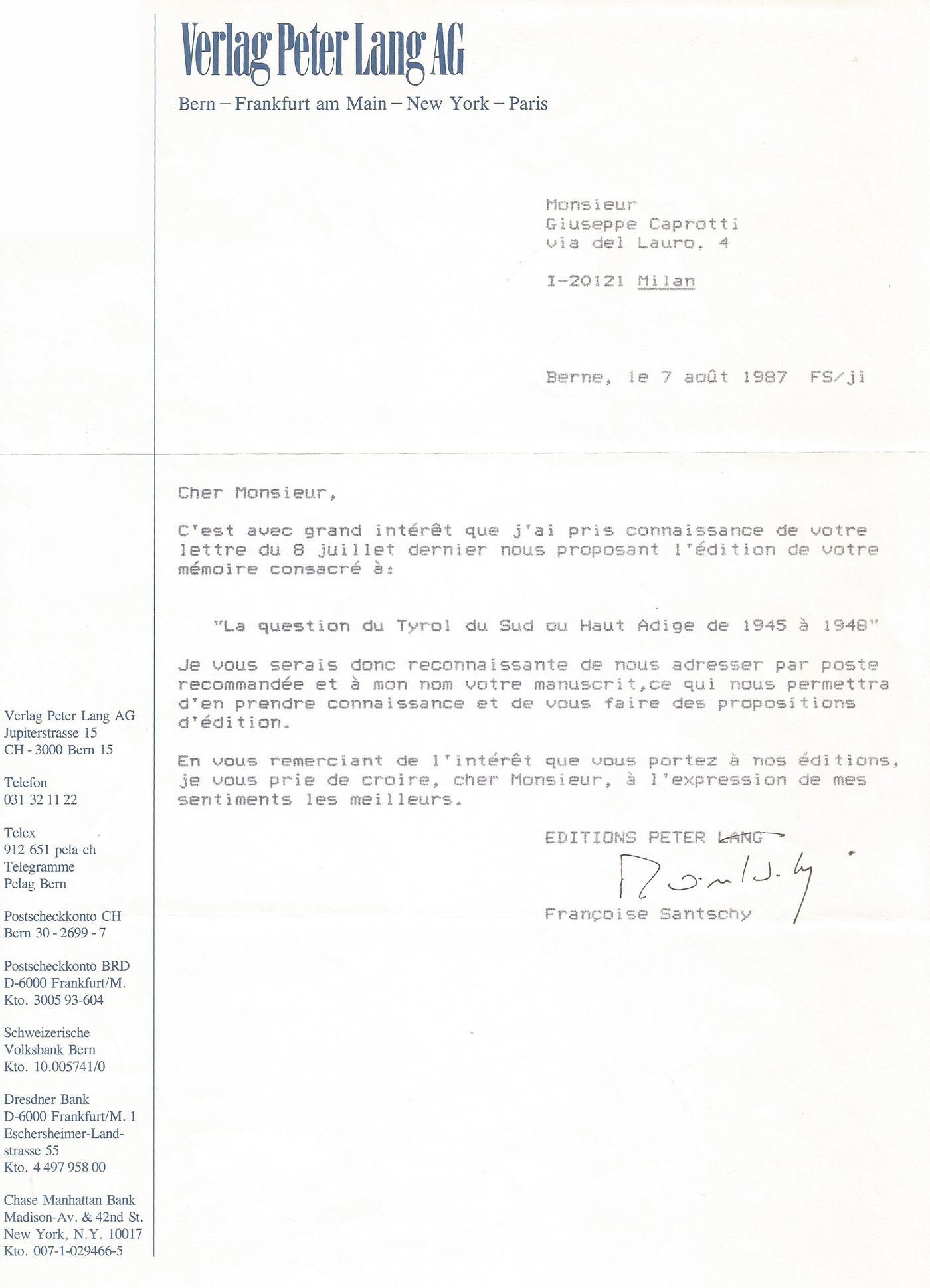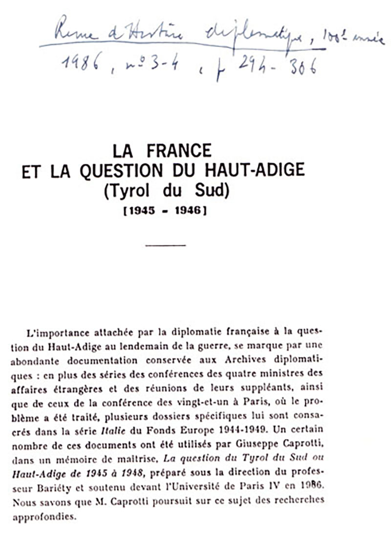 Ricordo che al primo incontro con gli studenti che volevano laurearsi con lui, il professor Jacques Bariéty , che era a capo del Centro di studi e di ricerche sulla Germania contemporanea della Sorbona, mi fece capire molto chiaramente che desiderava che mi occupassi della questione: ero italiano e il Quai d’Orsay (*), ospitava una gran quantità di documenti riguardanti la questione dell’Alto Adige.