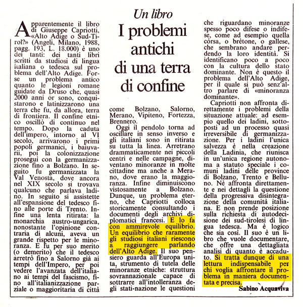 Il sociologo Sabino Acquaviva scrisse bene del mio libro (“lettura indispensabile”) anche su La Tribuna di Treviso.