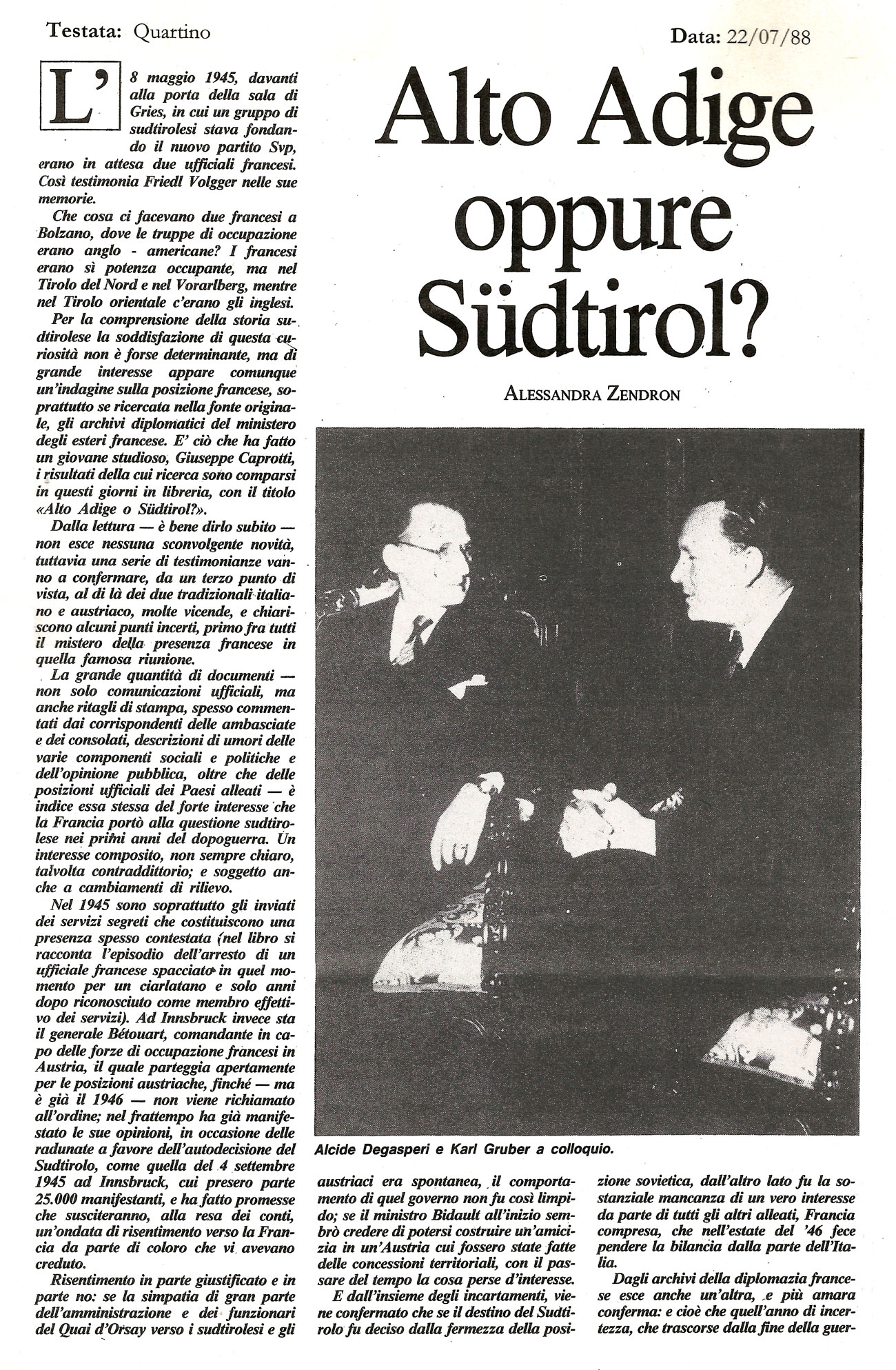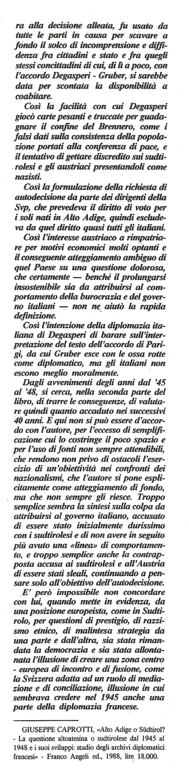 “Per la comprensione della storia sudtirolese la soddisfazione di questa curiosità non è forse determinante, ma di grande interesse appare comunque un’indagine sulla posizione francese, soprattutto se ricercata nella fonte originale, gli archivi diplomatici del ministero degli esteri francese. È ciò che ha fatto un giovane studioso, Giuseppe Caprotti, i risultati della cui ricerca sono comparsi in questi giorni in libreria, con il titolo «Alto Adige o Südtirol?».”
