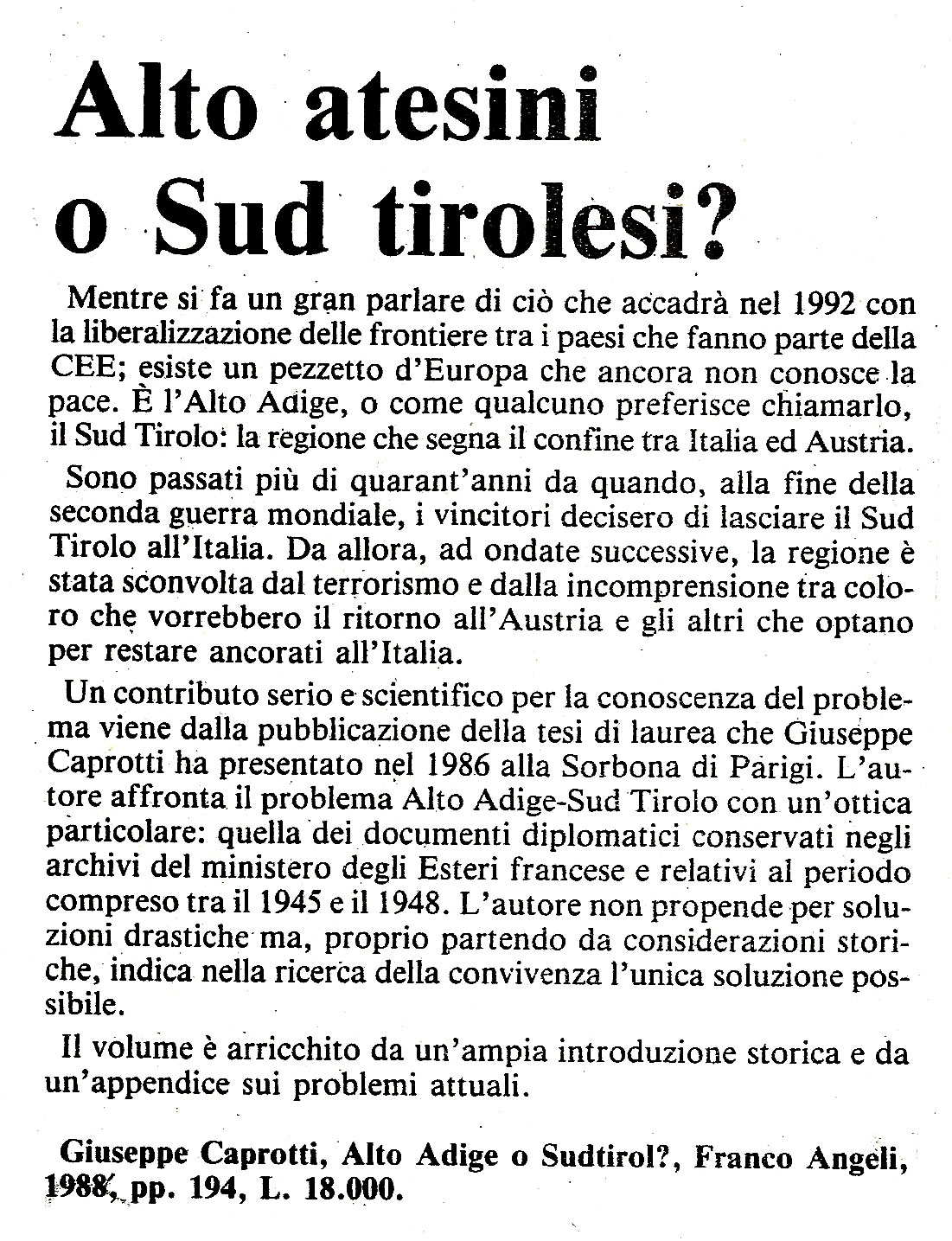 Un contributo serio e scientifico per la conoscenza del problema viene dalla pubblicazione della tesi di laurea che Giuseppe Caprotti ha presentato nel 1986 alla Sorbona di Parigi. L’autore affronta il problema Alto Adige-Sud Tirolo con un’ottica particolare: quella dei documenti diplomatici conservati negli archivi del ministero degli Esteri francese e relativi al periodo compreso tra il 1945 e il 1948. L’autore non propende per soluzioni drastiche ma, proprio partendo da considerazioni storiche, indica nella ricerca della convivenza l’unica soluzione possibile. Il volume è arricchito da un’ampia introduzione storica e da un’appendice sui problemi attuali. Giuseppe Caprotti, Alto Adige o Sudtirol?, Franco Angeli, 1988, pp. 194, L. 18.000.”