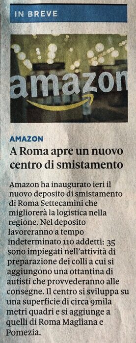 Amazon ha inaugurato ieri il nuovo deposito di smistamento di Roma Settecamini assumendo 110 addetti, tra preparatori di colli ed autisti.