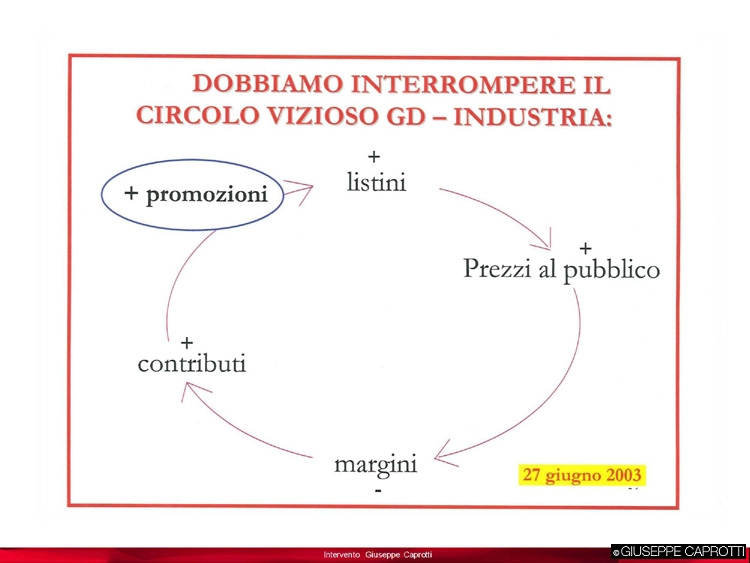 Sotto lo schema del “classico” circolo vizioso dei contratti annuali Industria – Grande Distribuzione , dove ad ogni rinnovo l’industria proponeva incrementi di listini che non riflettevano incrementi di costi reali ma anticipavano future richieste della grande distribuzione ( e cioè contributi promozionali, volti a compensare perdite di margine). Questo schema venne presentato dal sottoscritto a Centromarca nel 2003 (*).
