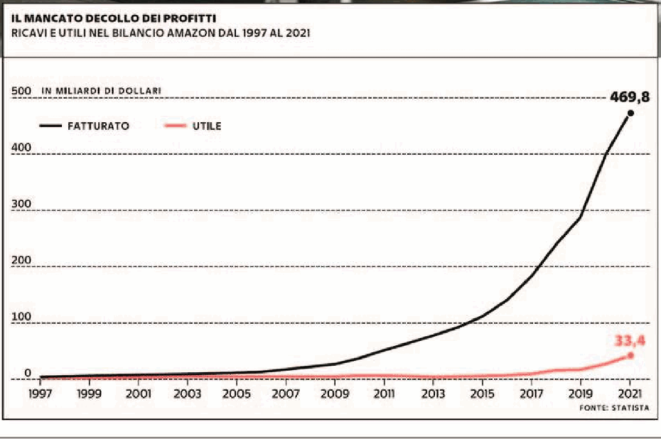Jeff aveva costruito Amazon nel 1994 dal garage di casa, grazie ad un prestito da 245.573 dollari dei suoi genitori, tanto generoso quanto scriteriato, almeno all’epoca. Ora possiede una compagnia che vale 1,5 trilioni di dollari, la seconda dopo Apple a varcare questa soglia, e si litiga con Elon Musk il titolo di uomo più ricco al mondo. Nel 2021 ha incassato ricavi per 469 miliardi di dollari, ossia circa una ventina di vecchie “finanziarie” italiane, e profitti per 33,36 miliardi. Pochini, in proporzione. C’è un perché, che poi ci aiuterà a capire meglio questa storia. Dà lavoro a 1,6 milioni di persone, anchese non tutte felicissime, perché si oppone strenuamente all’ingresso dei sindacati nei suoi stabilimenti, urtando così pure il presidente Biden. La pandemia lo ha aiutato, se ne avesse avuto bisogno, perché ci ha costretti ancor più a fare acquisti da casa. Così ha affittato altri 12 Boeing 767 cargo, portando la sua flotta a 80 aerei, e aperto oltre 200 centri per impacchettare e consegnare le merci. Oltre il 70% degli americani ha usato Amazon durante il Covid, e circa la metà di loro non ha più alcuna intenzione di rimettere piede in un negozio di mattoni.