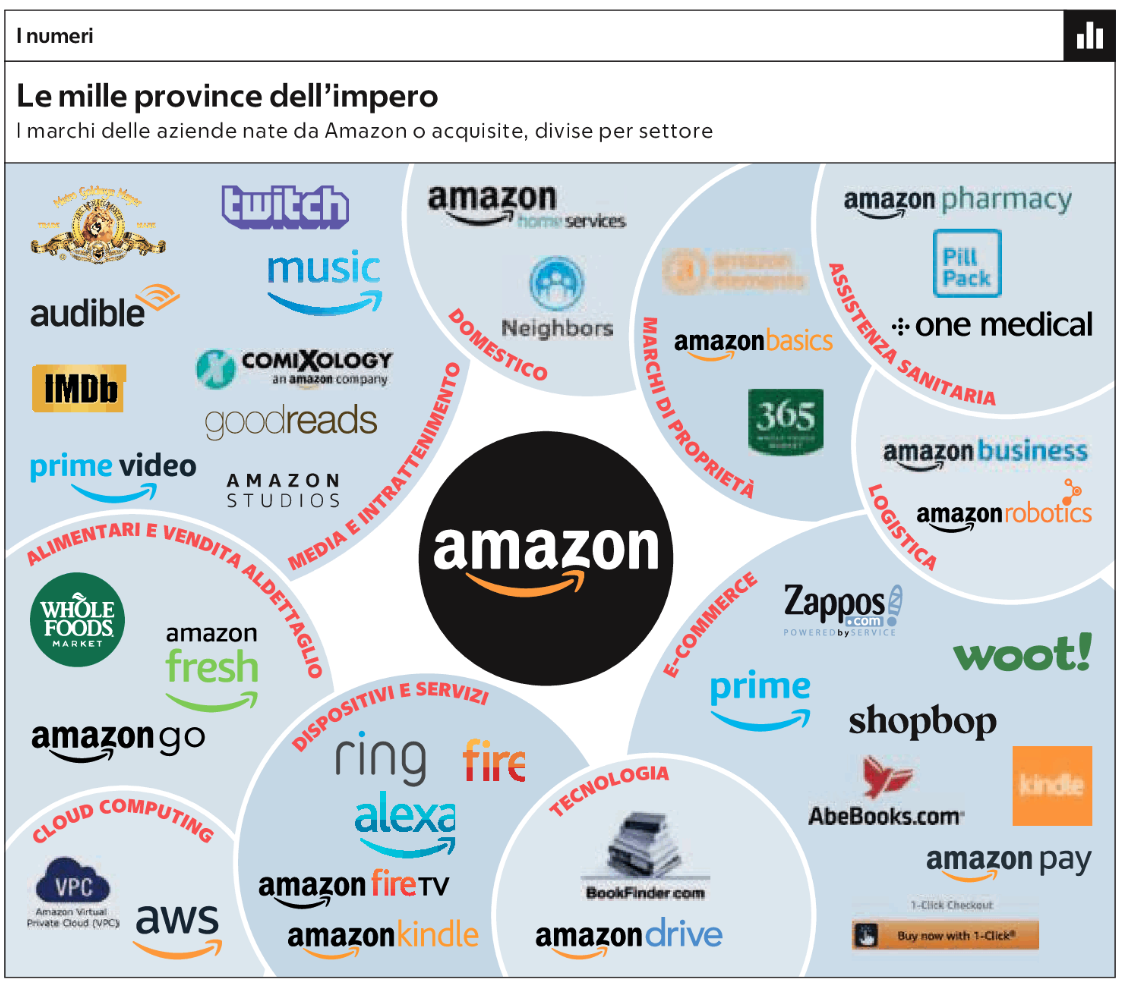Nel corso degli anni la libreria si è allargata in ogni direzione: ha speso 13,7 miliardi di dollari per comprare i supermercati Whole Foods; 8,45 per gli studi cinematografici e televisivi Mgm; 1,2 per i veicoli autonomi Zoox; 1,2 per le scarpe e l’abbigliamento di Zappos; 970 milioni per il servizio streaming specializzato nei videogame Twitch; 839 milioni per i campanelli e la sicurezza delle abitazioni Ring; 775 milioni per i robot di Kiva; 753 milioni per la farmacia Pill-Pack, e 580 milioni per Souq, la più grande piattaforma di commerci online nel mondo arabo.