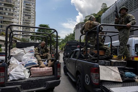 Agenti della polizia militare sorvegliano la cocaina sequestrata durante un’operazione contro i narcotrafficanti nella favela di Rocinha a Rio de Janeiro, Brasile, il 17 dicembre 2024. PABLO PORCIUNCULA / AFP