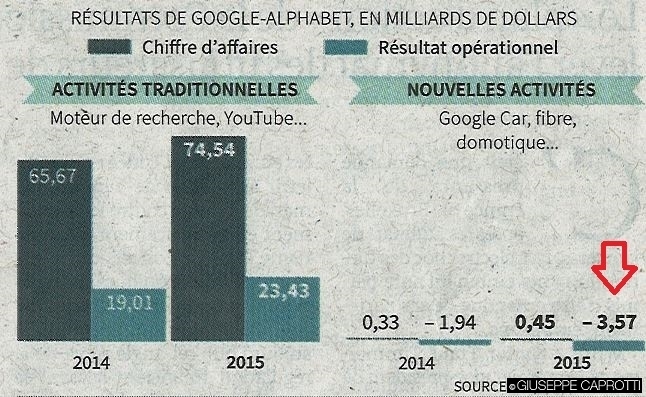Le zone d’ombra sono che Google non riesce a far pagare i click sugli smartphone tanto quanto quelli su pc, ma soprattutto che le “nuove attività” (domotica, fibra, Google car..) di Google, nel 2015, hanno perso 3,75 miliardi di $, con un incremento dell’84% rispetto all’anno scorso.