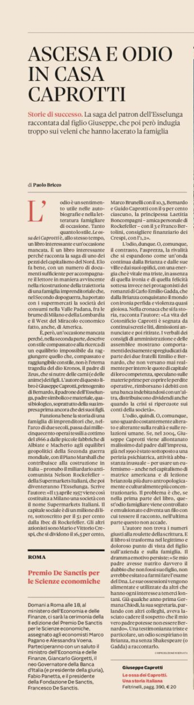 …”E’ un libro interessante perchè racconta la saga di uno dei pezzi del capitalismo del Nord. E lo fa bene, con un numero di documentì sufficiente per accompagnare il lettore in maniera avvincente nella ricostruzione della traiettoria di una famiglia imprenditoriale che nel Secondo dopoguerra , ha portato con i supermercati la società dei consumi nella Valle Padana, fra le brume di Milano e della Lombardia e il West del Miracolo economico fatto , anche di America”…