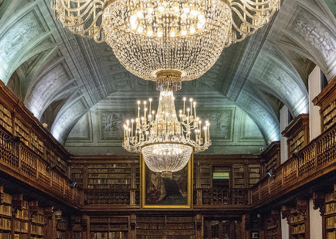 … restituendo alla sala Maria Teresa della Biblioteca Braidense gli splenditi lampadari in cristallo di Boemia restaurati grazie al contributo di Giuseppe Caprotti, unici due esemplari rimasti dei dodici che un tempo arredavano la sala delle Cariatidi