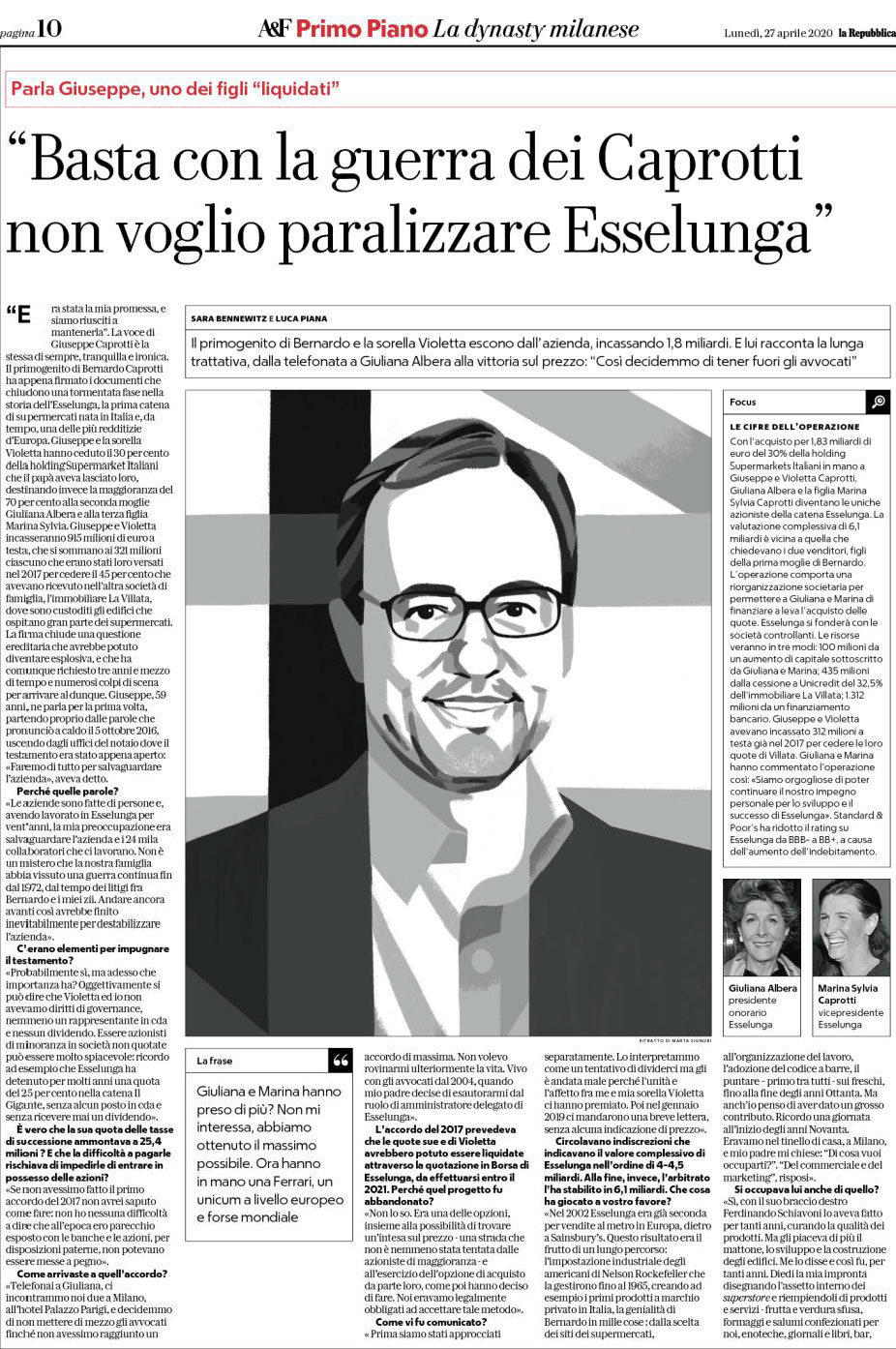 “Era stata la mia promessa, e siamo riusciti a mantenerla”. La voce di Giuseppe Caprotti è la stessa di sempre, tranquilla e ironica. Il primogenito di Bernardo Caprotti ha appena firmato i documenti che chiudono una tormentata fase nella storia dell’Esselunga, la prima catena di supermercati nata in Italia e, da tempo, una delle più redditizie d’Europa. Giuseppe e la sorella Violetta hanno ceduto il 30 per cento della holding Supermarket Italiani che il papà aveva lasciato loro, destinando invece la maggioranza del 70 per cento alla seconda moglie Giuliana Albera e alla terza figlia Marina Sylvia. Giuseppe e Violetta incasseranno 915 milioni di euro a testa, che si sommano ai 321 milioni ciascuno che erano stati loro versati nel 2017 per cedere il 45 per cento che avevano ricevuto nell’altra società di famiglia, l’immobiliare La Villata, dove sono custoditi gli edifici che ospitano gran parte dei supermercati. La firma chiude una questione ereditaria che avrebbe potuto diventare esplosiva, e che ha comunque richiesto tre anni e mezzo di tempo e numerosi colpi di scena per arrivare al dunque. Giuseppe, 59 anni, ne parla per la prima volta, partendo proprio dalle parole che pronunciò a caldo il 5 ottobre 2016, uscendo dagli uffici del notaio dove il testamento era stato appena aperto: “Faremo di tutto per salvaguardare l’azienda”, aveva detto.