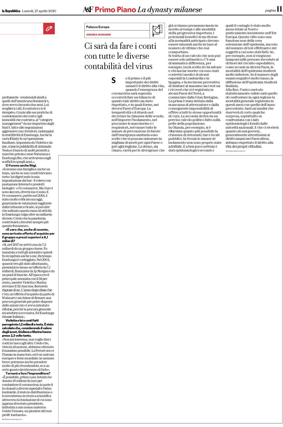“È possibile, prima o poi. Intanto ho donato 10 milioni di euro per combattere il coronavirus: in parte li ho donati a diversi ospedali e Onlus lombarde, il resto lo distribuiremo o lo investiremo in ricerca scientifica attraverso la fondazione di cui sono appena diventato presidente, intitolata a mio nonno materno Guido Venosta, un pioniere del non profit lombardo”.