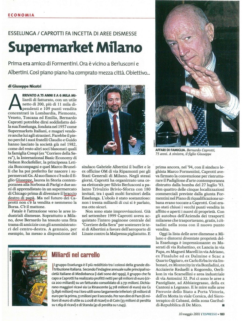 “La grande evoluzione commerciale dell’azienda è stata fatta in questi ultimi dieci anni, con l’inserimento di nuovi reparti e nuove merceologie; dal General Merchandise (non food ) al bio è stato un lungo e faticoso percorso. Di questo va dato merito al dottor Giuseppe (Caprotti) ed anche al signor De Gennis” Bernardo Caprotti, Maggio 2001