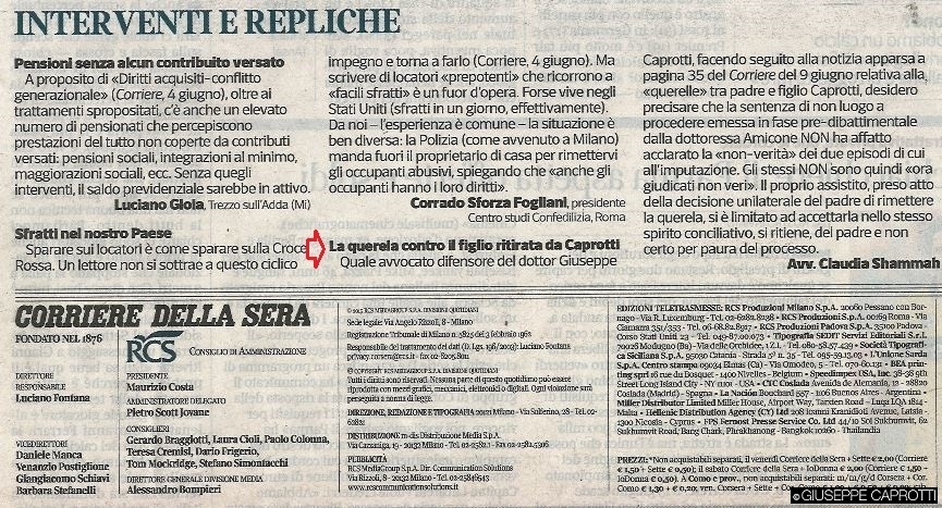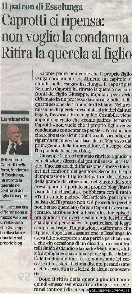 “La sottoscritta Avvocato Claudia Shammah, difensore del Dott. Giuseppe Caprotti, facendo seguito alla notizia apparsa a pag. 35 del Corriere della Sera in data odierna relativa alla “querelle” tra padre e figlio Caprotti, desidera precisare che la sentenza di non luogo a procedere emessa in fase pre-dibattimentale dalla Dott.ssa Amicone NON ha affatto acclarato la “non-verità” dei due episodi di cui all’imputazione.