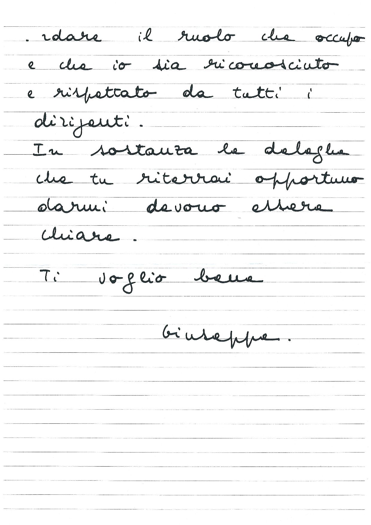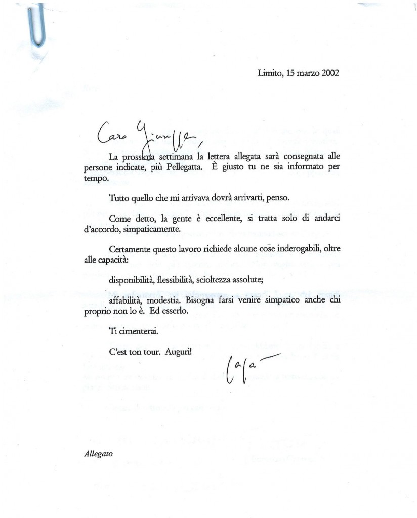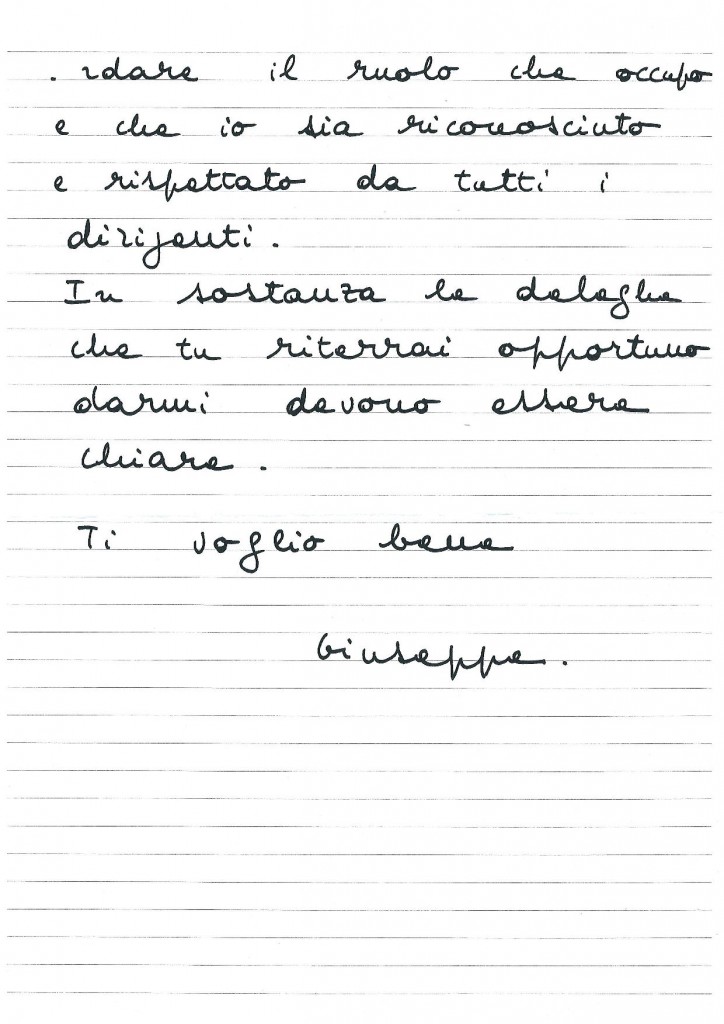 Dovevo anche chiedergli di salvaguardare il mio ruolo e di darmi (darci) delle deleghe chiare. Il rischio che lui mi delegittimasse era all’ordine del giorno, come vedremo di seguito.