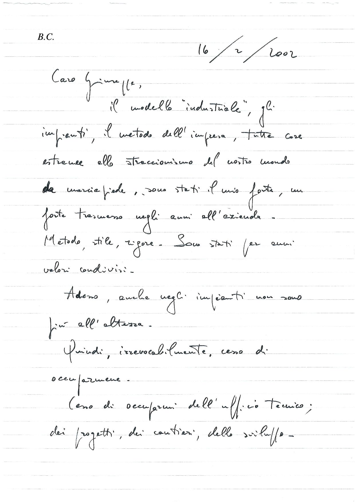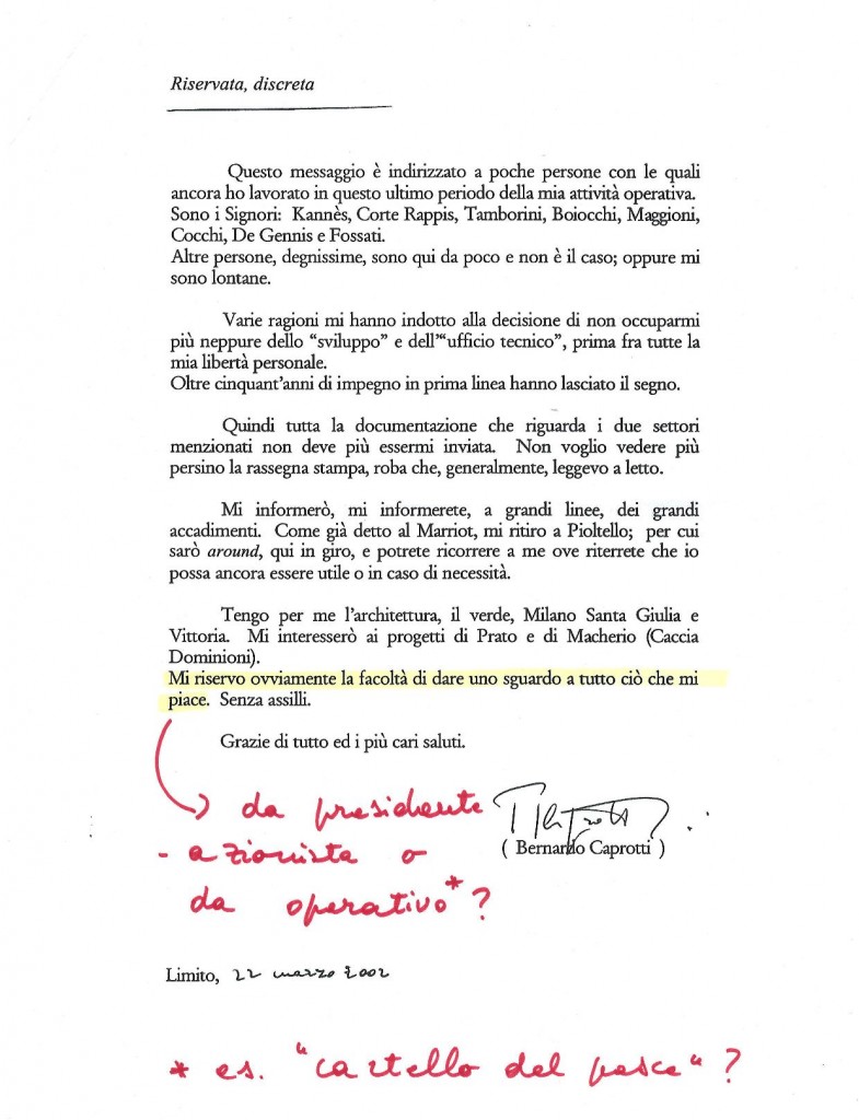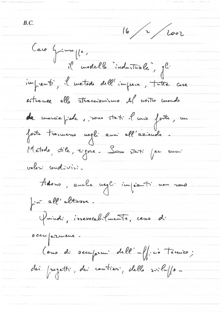 Le Produzioni di Esselunga avevano subito un danno consistente e Bernardo, che aveva preso le decisioni a monte sugli impianti produttivi (*), decideva di “ritirarsi”, come potete leggere dalla lettera seguente