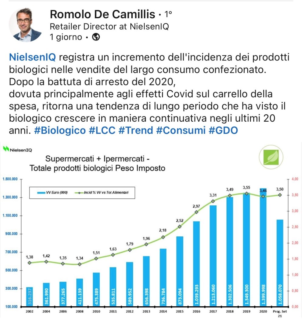 Dopo la battuta d’arresto del 2020, dovuta principalmente agli effetti del Covid sul carrello della spesa, ritorna una tendenza di lungo periodo che ha visto il biologico crescere in maniera continuativa negli ultimi 20 anni”.