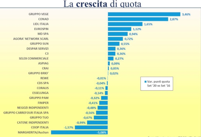 Si può aggiungere che sicuramente uno dei motivi che penalizzano fortemente Carrefour – al di là di tutti quelli già detti (management che cambia troppo spesso, non italiano ai piani alti, troppi format, etc.) è la sua presenza nel segmento ipermercati dove Amazon (*), che dovrebbe essere a tutti gli effetti nella chart delle quote di mercato (sotto), la sta probabilmente “massacrando”.