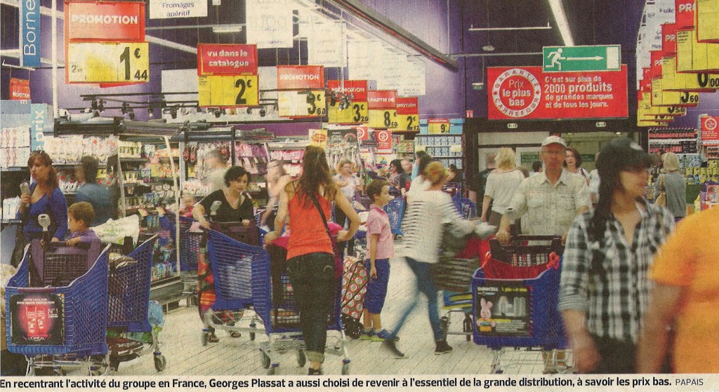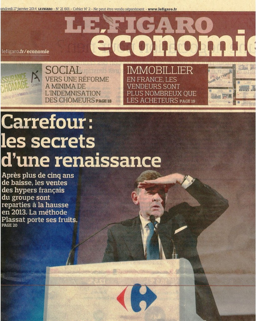In aprile 2012 Georges Plassat ha preso in mano le redini del gruppo Carrefour e un anno e mezzo dopo, il 15 gennaio 2014 ha annunciato che la crescita delle vendite degli iper francesi è stata pari all’1% nel 2013, dopo cinque anni di cali continui, tanto che Le Figaro titolava : “Carrefour, i segreti di una rinascita” (v. sotto).