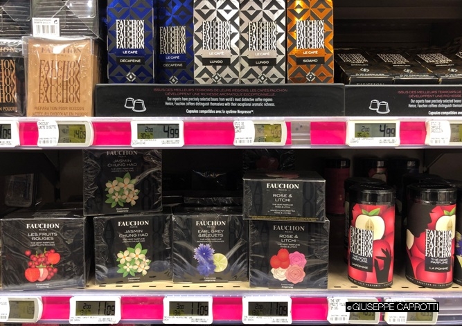 Sotto: prodotti di Fauchon sugli scaffali di Monoprix (che appartiene alla catena della Grande Distribuzione, Casino), a Parigi, qualche settimana fa (nel 2019 per chi legge).