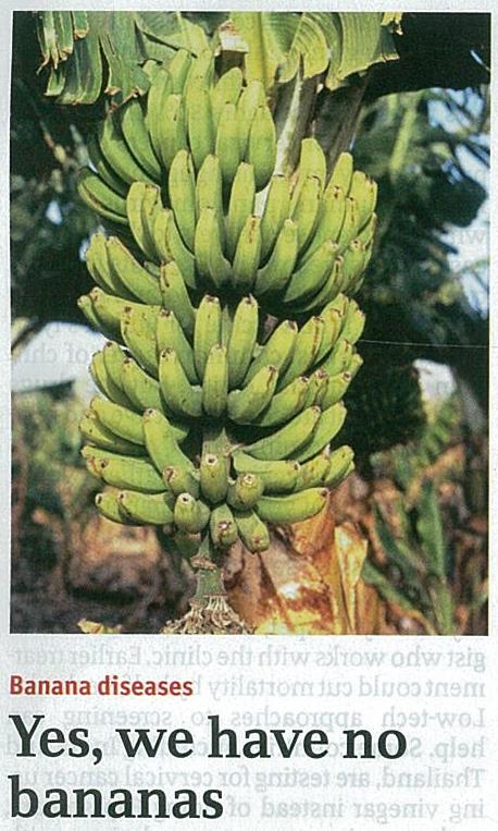 2) a livello di produzione la banana Cavendish, che rappresenta il 95% delle banane vendute, è attaccata da due malattie, la Black Sigatoka e la Foc Tropical Race 4.