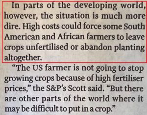 “In parte del mondo in via di sviluppo, però, la situazione è molto più tragica. Gli alti costi potrebbero forzare alcuni agricoltori sud americani o africani a lasciare le piante non fertilizzate o i campi abbandonati” (Financial Times, 4-5 giugno 2022, vedi sotto).