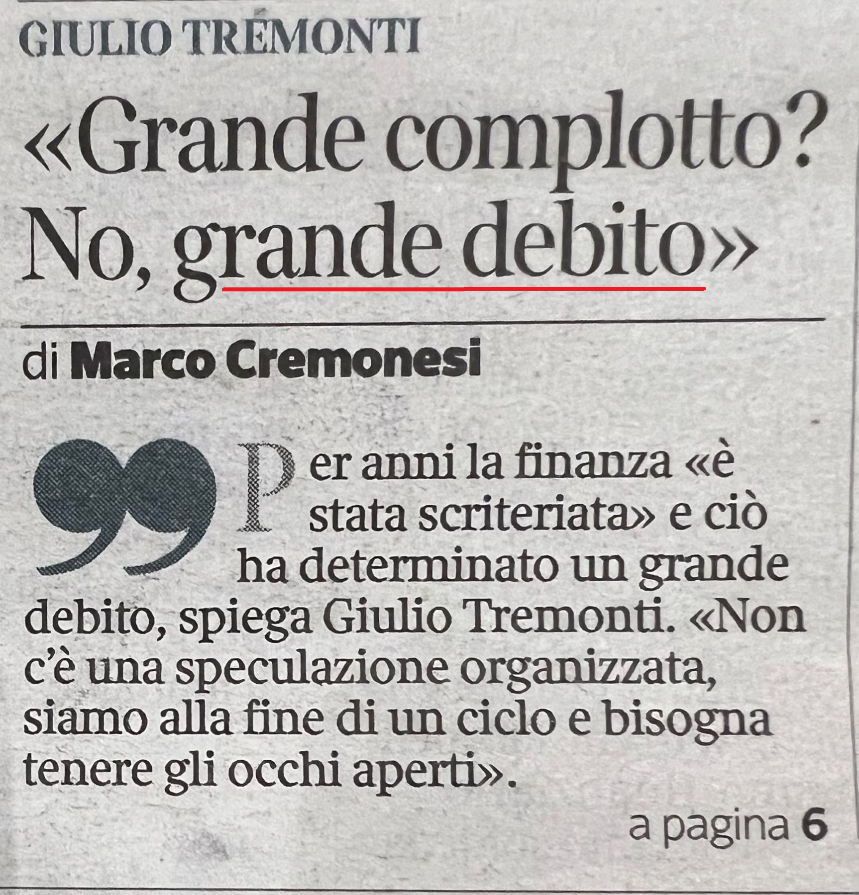 Sotto : Giulio Tremonti , sul Corriere delle Sera del 2 ottobre 2023, ricorda che il problema dell’Italia è il suo “grande debito“.