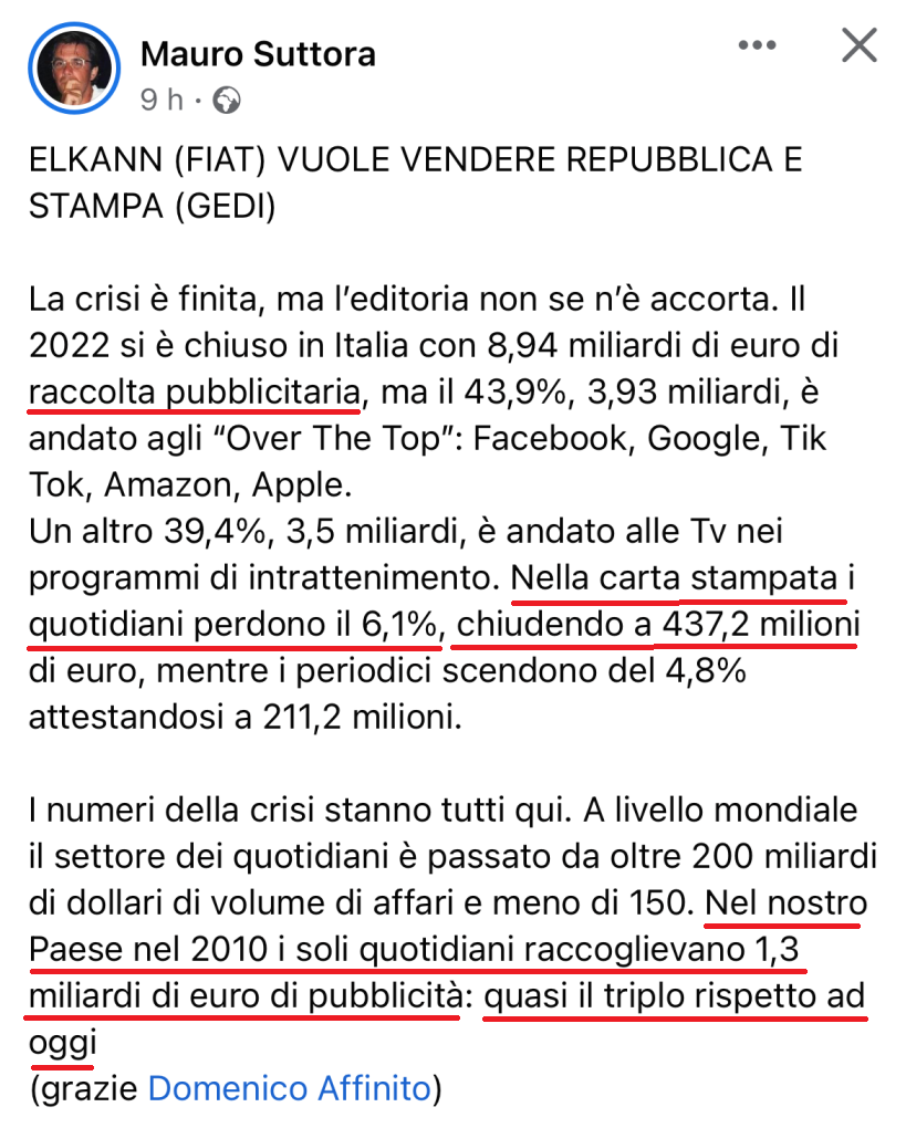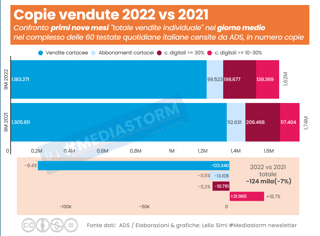 I dati sulla raccolta pubblicitari sono confermati da Prima Comunicazione : 2022 annus horribilis per la pubblicità su stampa (-5,8%) e quotidiani (-6,1%).