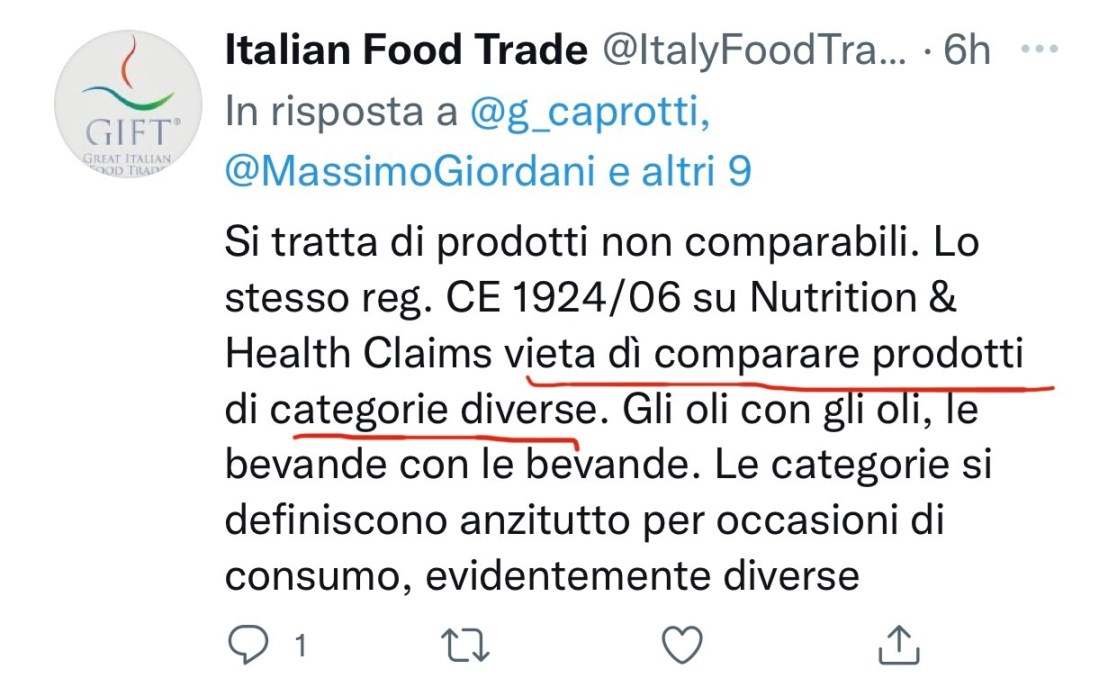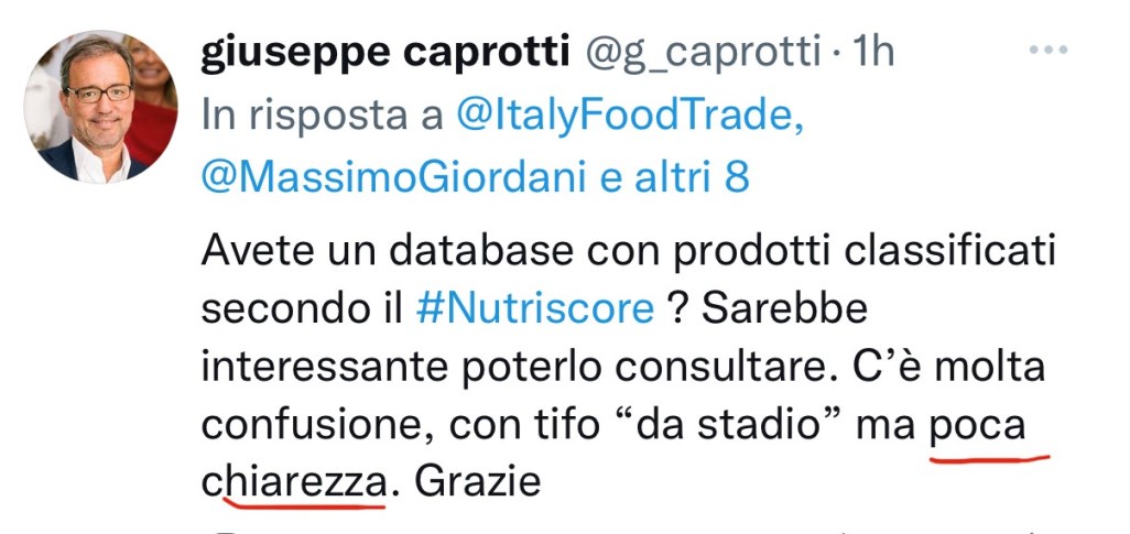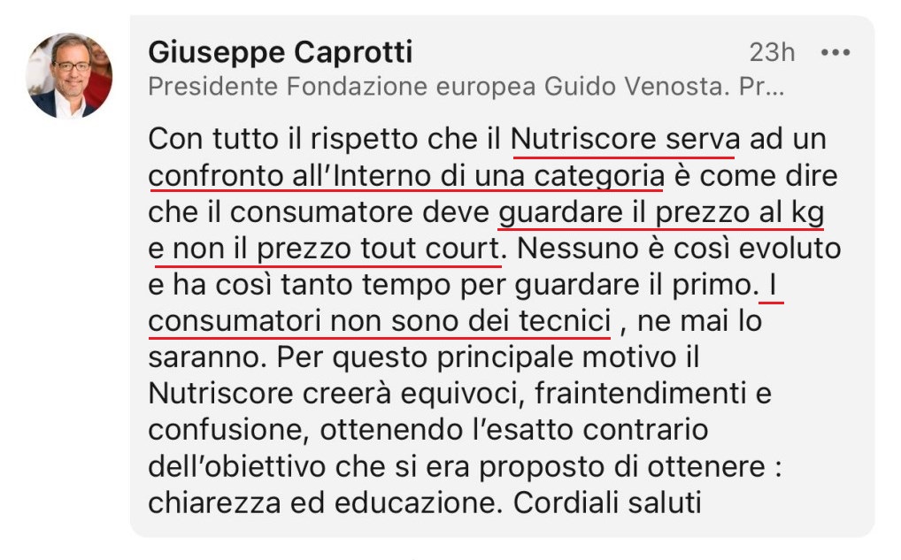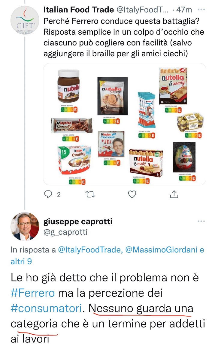 Faccio presente che il problema non è la multinazionale di Alba ma la comprensione del Nutriscore da parte dei consumatori.