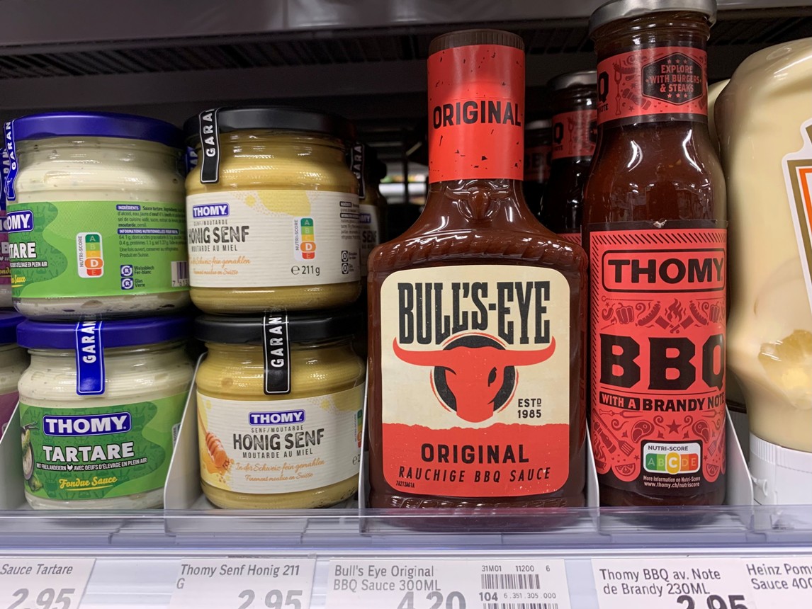 In mezzo ai prodotti della multinazionale di Vevey si trova la Bull’s eye sauce della Kraft Heinz, senza Nutriscore.