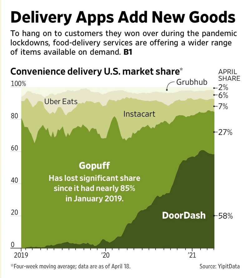 E ha preso la leadership del convenience delivery. Di cui ha il 58% di quota di mercato. Gopuff, che segue, il 27% con 400 magazzini. Instacart solo il 7%, Uber Eats il 6% e Grubhub il 2%.