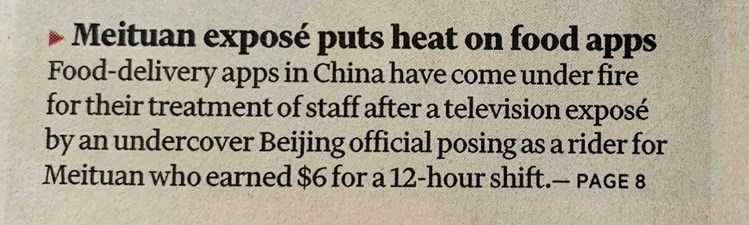 - Ovviamente il delivery non dovrebbe esimersi dal porsi problemi di etica . E, più che l’esempio di Gorillas, recentemente contestata in piazza in Germania, dovrebbe pensare al caso Meituan, in Cina : la app , leader mondiale del delivery (3), è incappata in uno scandalo colossale perchè pagava 6 $ per 12 ore di lavoro i propri rider (fonte Financial Times del 29 aprile sotto).