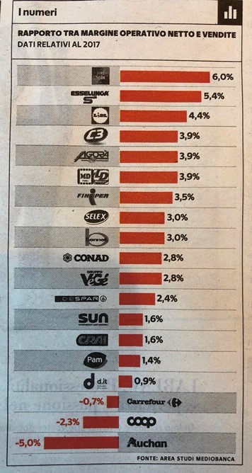 Tra l’altro la Coop non sembra brillare per efficienza : nel rapporto tra margine operativo netto e vendite, nel 2017, si piazzava penultima, prima di Auchan, che ormai non esiste più.